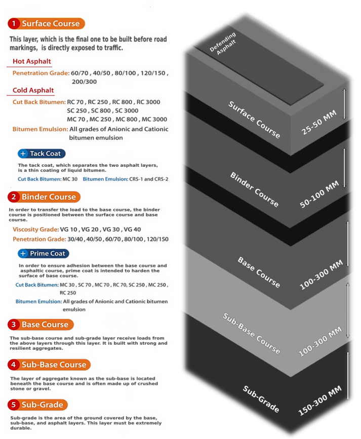 The surface course, base course, and sub base course are the three main tiers. Tack coat, binder course, and prime coat are the sub layers that are positioned between the major layers to bind them together. To shield the surface course from harm, protective Bitumen are also utilized.