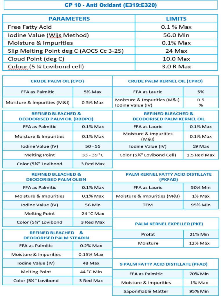 RBD Palm Olein CP10 has an iodine value of 56. Because of its fatty acid composition and good oxidative stability, Palm Olein CP10 is excellent to be used as liquid cooking oil and more suitable for frying.