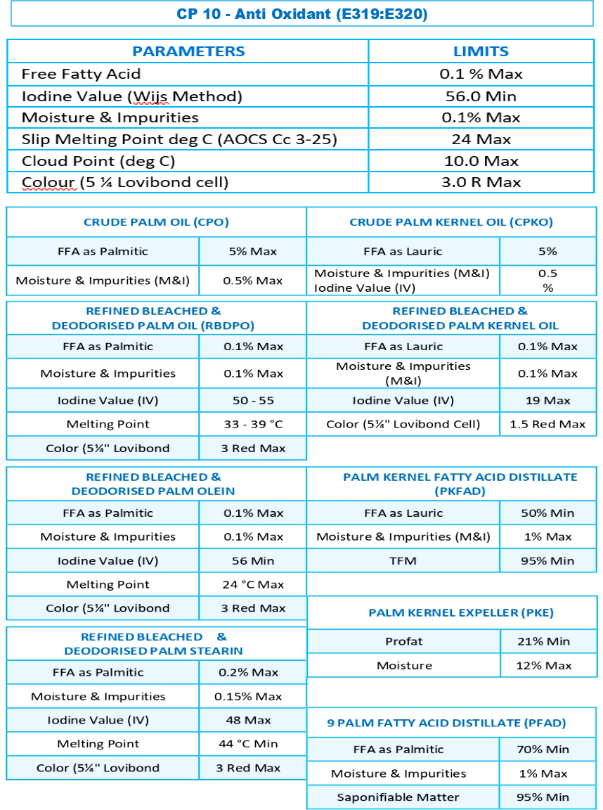 RBD Palm Olein CP10 has an iodine value of 56. Because of its fatty acid composition and good oxidative stability Palm Olein CP10 is excellent to be used as liquid cooking oil and more suitable for frying.
